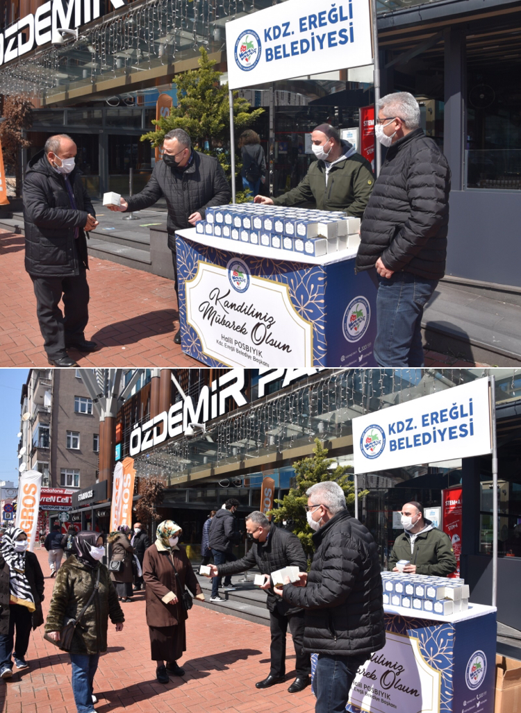 Kdz. Ereğli Belediyesi Özel Kalem Müdürlüğü ve Kültür Sosyal İşler Müdürlüğü ekipleri, Berat Kandili öncesinde 5 bin adet kandil simidi dağıttı.