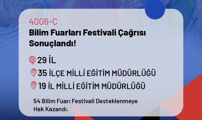 TÜBİTAK Bilim ve Toplum Başkanlığı tarafından bu yıl ilk kez açılan 4006-C Bilim Fuarları Festivali Çağrısı kapsamında desteklenmeye hak kazanan projeler açıklandı.