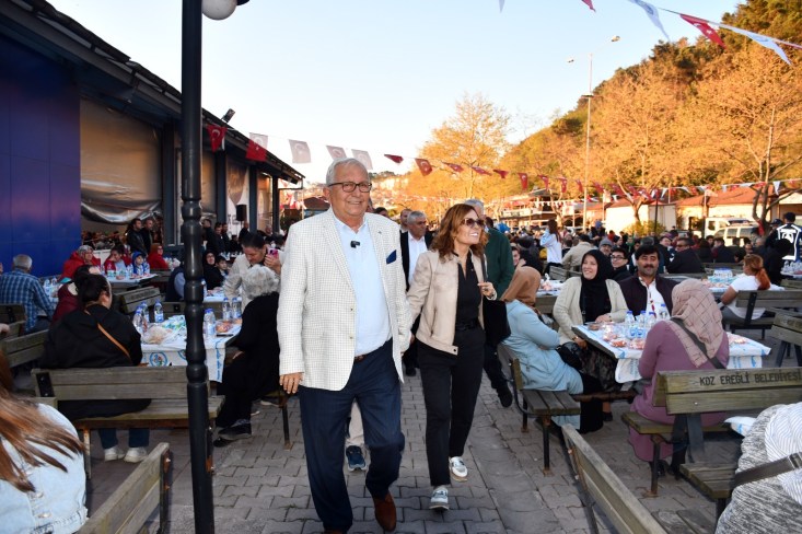 “Yüce rabbime şükürler olsun ki Kadir Gecesi’nde bir arada iftarımızı yapıyoruz. Bu akşam kadir Gecesi münasebetiyle 6 bin kişiyi burada misafir ediyoruz. Aynı zamanda ayakta kalan bin 500 kişiye yemeklerini ikram ediyoruz. 25 yıldır gelenek hale getirdiğimiz şekilde ihtiyaç sahibi bin 500 vatandaşımızın da evlerine yemek götürüyoruz. Sizlerle bir arada olmak çok güzel. Bu akşam tatlılarımızı eğitimsever Zuhal Yılmaz’ın oğlu İhsan Yılmaz bizlere ikram etti, teşekkür ediyoruz. Pideleri de bütün fırıncı esnafımız gönderdi, kendilerine teşekkür ediyorum. Ramazan ayı başından itibaren bizleri yalnız bırakmayan Ereğli’nin değerli hocalarına teşekkür ediyorum. Allah hepinizden razı olsun. Allah bayramda sağlık sıhhat içerisinde bayramlaşmayı nasip etsin. Ramazan dedik başladı, sona yaklaştık ve Kadir Gecesi’nde bir kez daha buluştuk. Allah herkese sağlık sıhhat versin. Duaların kabul olduğu bu mübarek gecede Aşkım Ereğli’yle, sevdiklerimizle bir araya gelerek birlik beraberlik içinde olduk. Arife günü de şehir mezarlığında mevlit okutulacak. Tüm halkımızı mevlit programına davet ediyorum.