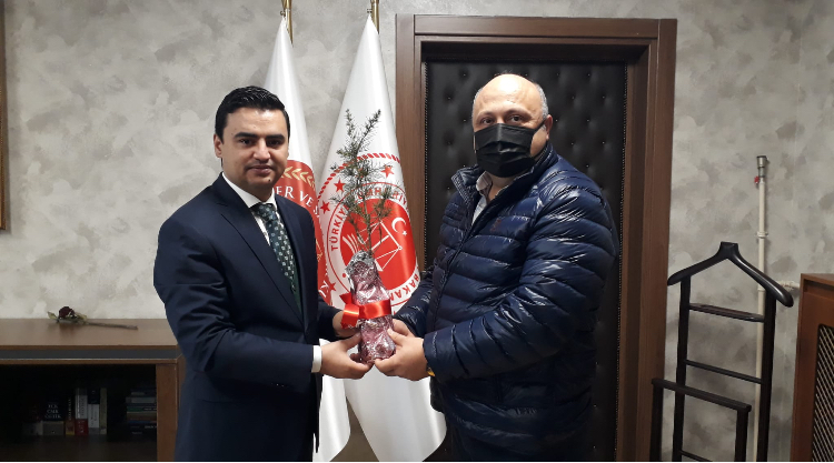 Kent Konseyi Başkanı Osman Yavuz, Başsavcı Akın Çetin’e tüplü çam fidanı armağan etti ve İlçenin sorunları hakkında fikir alışverişinde bulundu.