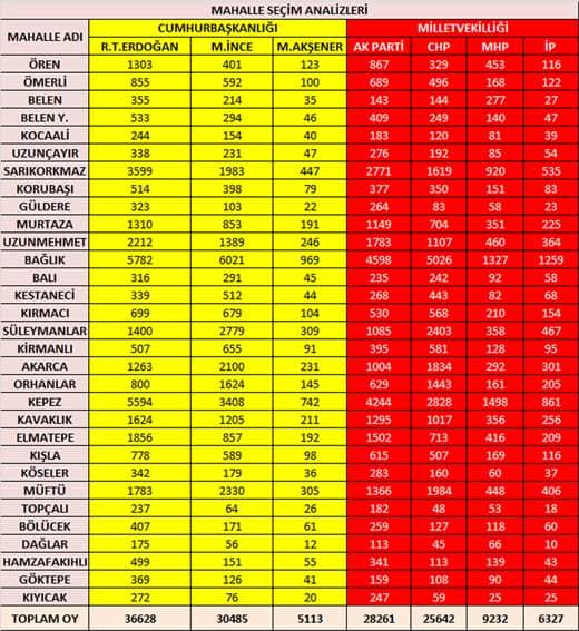 Erdoğan 31 mahallenin 25’inde sandıktan birinci çıkarken 1 mahalle 1 oy farkla olmak üzere toplam 6 mahalleden İnce birinci çıktı.