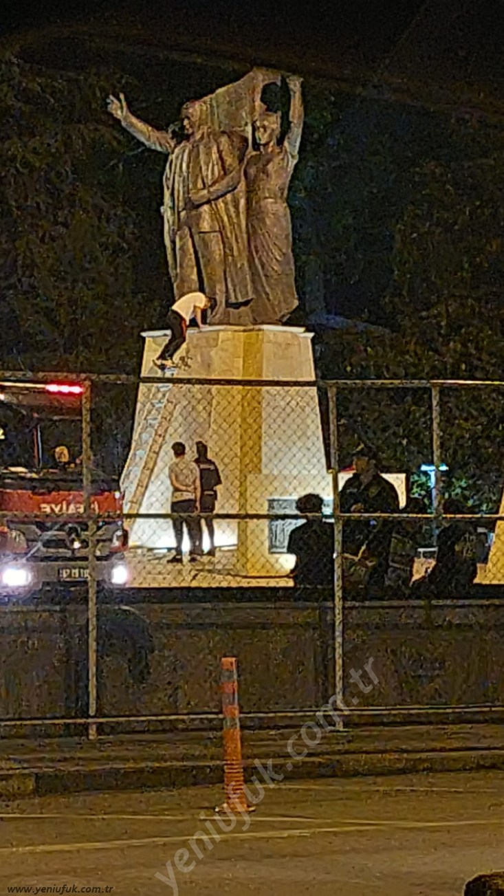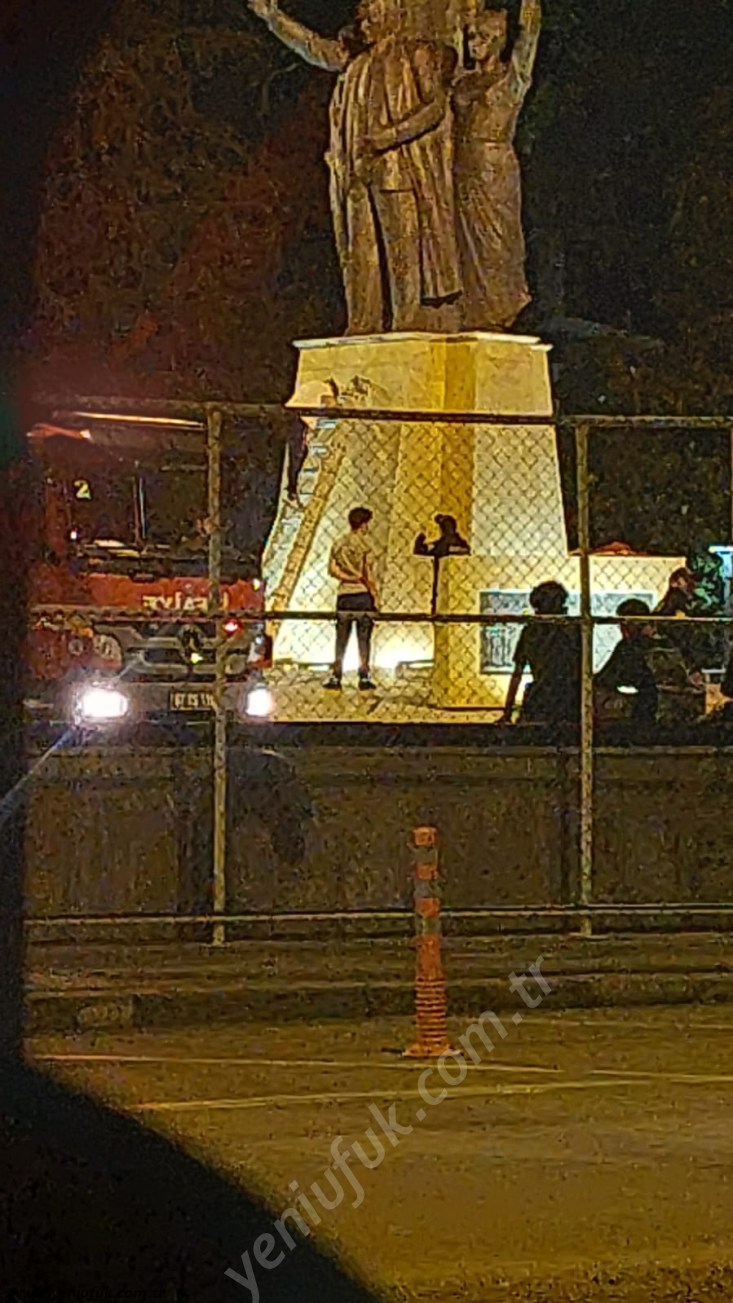 Kısa sürede olay yerine gelen itfaiye ekipleri, Atatürk büstüne tırmanan genci merdiven yardımıyla aşağıya indirdi.