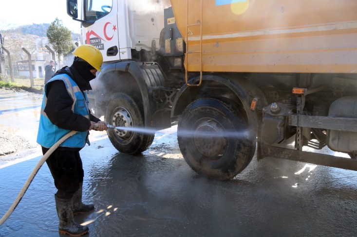 Firma yetkililerinin Başkan Posbıyık’a yaptığı ziyaretin ardından Belediye, kamyonların yıkanması için şehir şebekesinden su hattı bağladı, kamyonlardaki çamurlar temizlenmeye başladı.