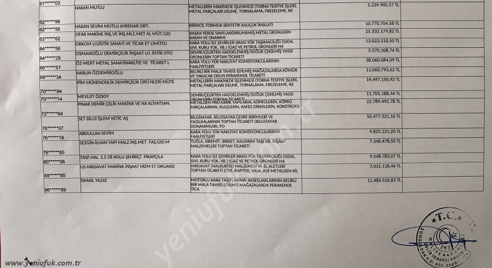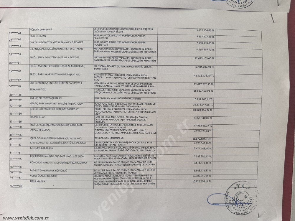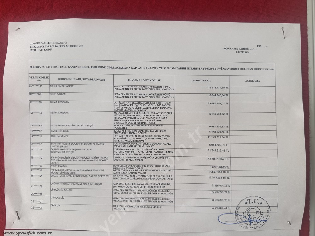 Kdz.Ereğli'de 30.09.2024 tarihi itibariyle 31.12.2023 vadeli borcu 5 milyon TL'nin üstüne olan 213 sayılı vergi usul kanununun 293 ve 564 sıra nolu genel tebliğlerine istinaden açıklanan 57 firmanın isimleri ve şahısların adları askıya çıkarıldı.