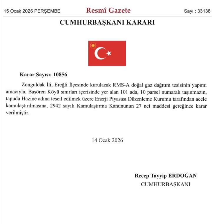 "Zonguldak İli, Ereğli İlçesinde kurulacak RMS-A doğal gaz dağıtım tesisinin yapımı amacıyla, Başören Köyü sınırları içerisinde yer alan 101 ada, 10 parsel numaralı taşınmazın, tapuda Hazine adına tescil edilmek üzere Enerji Piyasası Düzenleme Kurumu tarafından acele kamulaştırılmasına, 2942 sayılı Kamulaştırma Kanununun 27 nci maddesi gereğince karar verilmiştir.", denildi..
