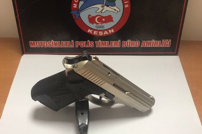 Edirne'de Keşan İlçe Emniyet Müdürlüğü ekipleri, Yukarı Zaferiye Mahallesi'nde yaptıkları kontrolde bir araçtan kurusıkı tabanca ele geçirdi.