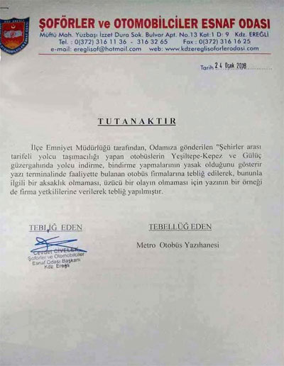 Girdiği her ortamda Şehirlerarası yolcu taşımacılığı yapan firmaların yolcu indirip-bindirmelerinin yasaklanması konusunu Kdz.Ereğli Belediye’sinin sorumluluğunda olduğunu iddia eden Kdz.Ereğli Şoförler ve Otomobilciler Odası Başkanı Cevdet Civelek ve yardımcısı Ahmet Küçük’ün Şehirlerarası Otobüs firmalarına gönderdiği tutanakla, yolcu indirmelerinin yasaklanması gerektiğini belirttiği ortaya çıktı.