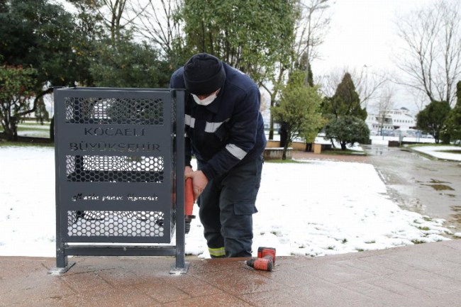 Kocaeli Büyükşehir Belediyesi Park, Bahçe ve Yeşil Alanlar Daire Başkanlığı, İzmit'te yeni çöp kovalarının montajını yapıyor.