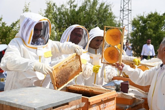 Selçuklu Belediye Başkanı Ahmet Pekyatırmacı beraberindeki protokol üyeleri ve basın mensupları ile birlikte Eğribayat Mahallesi'nde bal üreticileriyle bir araya gelerek ilk hasada yerinde tanıklık etti.
