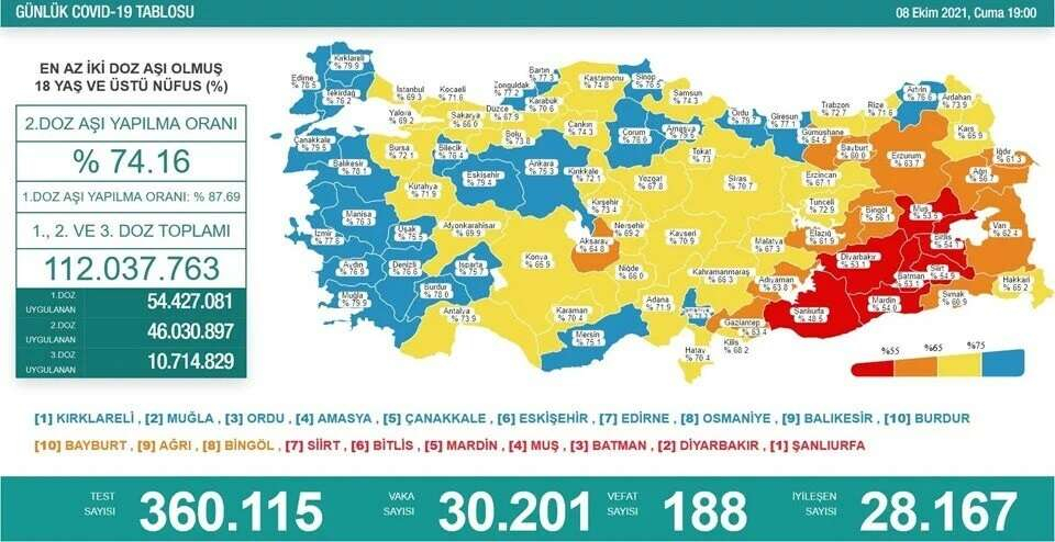 En az iki doz aşı uygulananların oranının en yüksek olduğu 10 il, Kırklareli, Muğla, Ordu, Amasya, Çanakkale, Eskişehir, Edirne, Osmaniye, Balıkesir ve Burdur oldu. En az iki doz aşı yapılanların oranının en düşük olduğu iller ise Şanlıurfa, Diyarbakır, Batman, Muş, Mardin, Bitlis, Siirt, Bingöl, Ağrı ve Bayburt olarak sıralandı.