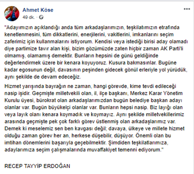 AK Parti Kdz.Ereğli Belediye Başkan aday adayı Ahmet Köse, adaylık tartışmalarıyla ilgili düşüncesini, sosyal medya'dan Recep Tayyip Erdoğan'ın sözlerini paylaşarak cevap verdi..