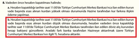 8’nci maddede yer alan bilgiye göre, kur korumalı TL mevduat hesabının belirlenen vadeden önce kapatılması durumunda, eğer güncel kur vade başındaki kurdan yüksekse, Hazine tarafından hesap sahibine bir ödeme yapılmayacak.