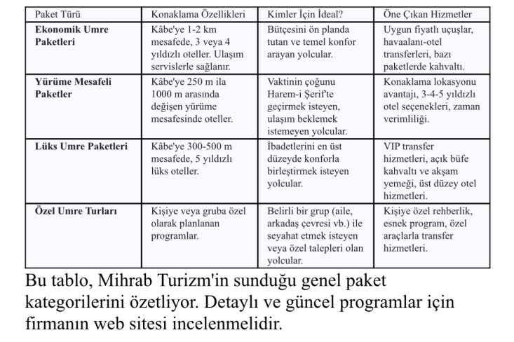 Her yolcunun beklentisi, bütçesi ve zamanı farklıdır. Bu bilinçle hareket eden Mihrab Turizm, sunduğu çeşitli umre turları ile her ihtiyaca cevap veren bir manevi yolculuk tasarlamayı amaçlar. Ekonomik seçeneklerden lüks paketlere, Kâbe'ye yürüme mesafesindeki konaklamalardan daha uzun süreli programlara kadar geniş bir yelpaze sunulmaktadır. Bu çeşitlilik, herkesin kendi manevi arayışına en uygun programı bulmasını sağlar.