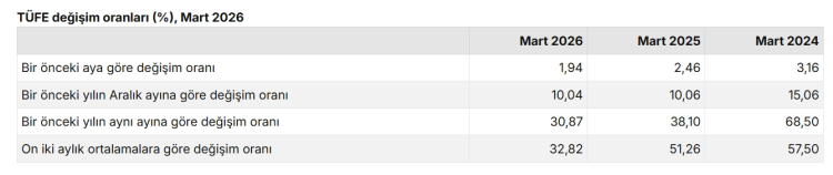 TÜFE'deki (2025=100) değişim 2026 yılı Mart ayında bir önceki aya göre yüzde 1,94 artış, bir önceki yılın Aralık ayına göre yüzde 10,04 artış, bir önceki yılın aynı ayına göre yüzde 30,87 artış ve on iki aylık ortalamalara göre yüzde 32,82 artış olarak gerçekleşti.