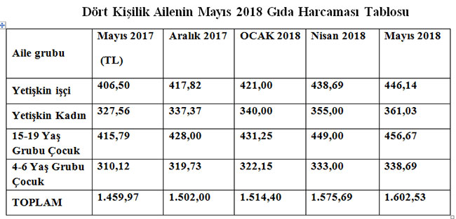 Genel Maden İşçileri Sendikası’nın Zonguldak’ta yaşayan 1 çalışan, 1 ev hanımı, 2 çocuk toplam dört kişiden oluşan çekirdek ailenin aylık gıda harcaması Mayıs 2018’de mutfak harcaması bir önceki aya göre yüzde 1.70 oranında arttı.