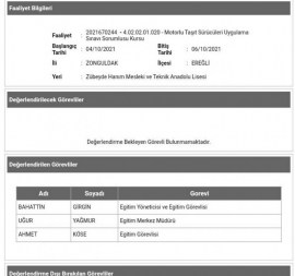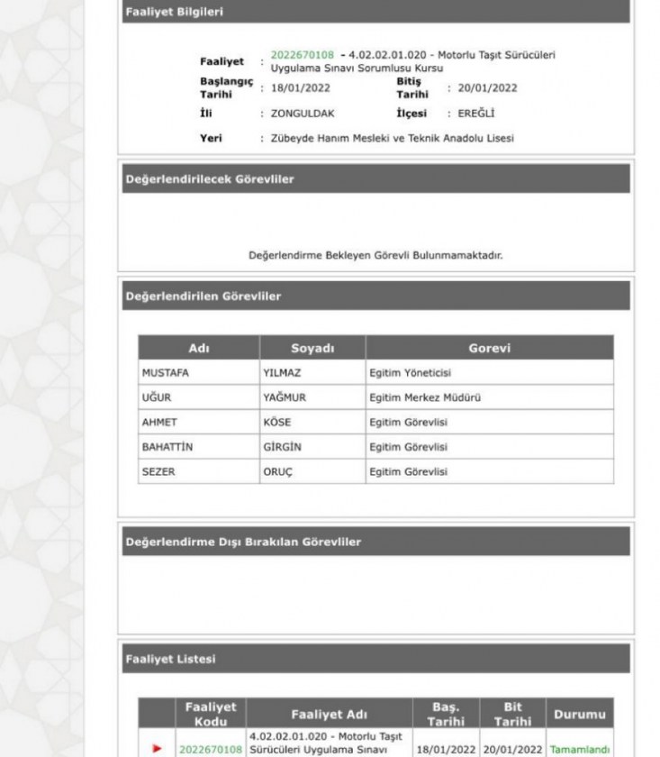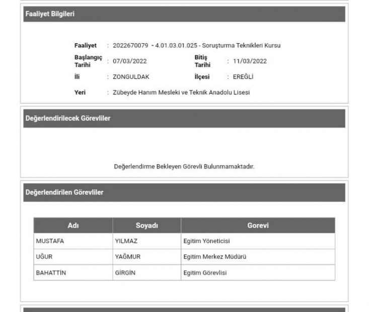 Ancak, Yeni Ufuk’un yaptığı araştırmaya göre; Kdz Ereğli İlçe Milli Eğitim Müdürlüğü Şube Müdürü Bahattin Girgin’in Eğitim Yöneticisi ve Merkez Müdürü olarak 29.01.2021 tarihindeki Kdz.Ereğli Kandilli Mesleki ve Teknik Anadolu Lisesindeki İlk Yardım Eğitim Kursu’nda 04.10.2021 tarihinde Eğitim Yöneticisi ve Eğitim Görevlisi olarak Zübeyde Hanım Mesleki ve Teknik Anadolu Lisesindeki Motorlu Taşıt Sürücüleri Uygulama Sınavı Sorumlusu Kursu’nda, 03.07.2022 tarihinde Eğitim Görevlisi olarak Zübeyde Hanım Mesleki ve Teknik Anadolu Lisesindeki Soruşturma Teknikleri Kursu’nda ve 18.01.2022 tarihinde Eğitim Görevlisi olarak Zübeyde Hanım Mesleki ve Teknik Anadolu Lisesindeki Motorlu Taşıt Sürücüleri Uygulama Sınavı Sorumlusu Kursu’nda görev aldığı belgelendi.