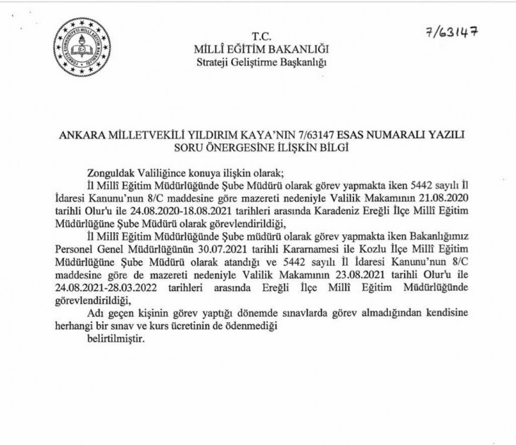 Milli Eğitim Bakanlığı Kdz Ereğli İlçe Milli Eğitim Müdürlüğü’nde görevli Şube Müdürü Bahattin Girgin ile ilgili TBMM’ye verilen soru önergesini cevapladı.