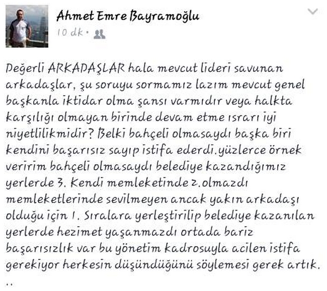 MHP Gülüç İlçe Başkanı Atilla Tarık Semiz'in sosyal medya hesabı üzerindeki isyanının ardından, 1 Kasım seçimleri MHP 3. sıra adayı Dr. Ahmet Emre Bayramoğlu'da, sosyal medya hesabından bir paylaşım yaparak; MHP Liderine ateş püskürdü!..