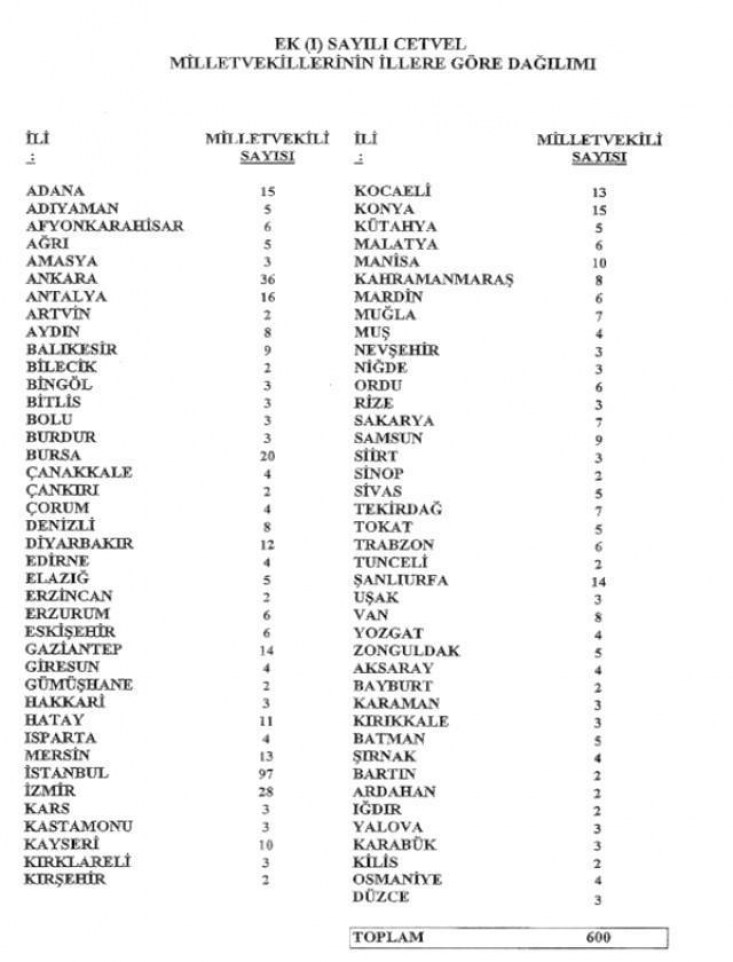 MİLLETVEKİLİ SAYISI 600 OLDU... (İşte İl İl milletvekili sayısı)