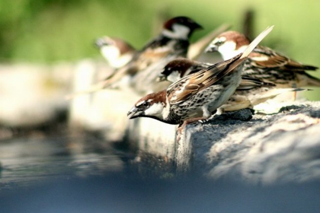 Önce su havuzunun bitişiğindeki kiraz ağacına konuyor, dal ve yaprakların arasından çevreyi kolaçan ediyor, güvenlikten emin olduklarında aşağı süzülerek havuzun kıyısına konup susuzluklarını gideriyorlar. Sulama havuzunun bulunduğu bölge kuş cıvıltılarıyla doluyor.