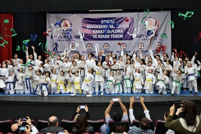 21 ayrı branşta ücretsiz spor kursu veren Denizli Büyükşehir Belediyesi, karate kursunda başarılı olan küçük sporcular için diploma ve kuşak töreni düzenledi. Küçük sporcuların sevincini paylaşan Başkan Osman Zolan, "Tüm imkânlarımızı çocuklarımız için seferber ediyoruz" dedi.