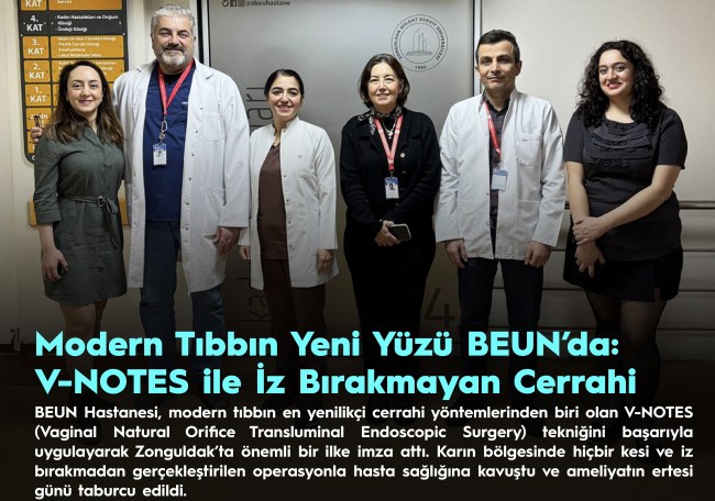 Zonguldak Bülent Ecevit Üniversitesi (BEUN) Hastanesi, modern tıbbın en yenilikçi cerrahi yöntemlerinden biri olan V-NOTES (Vaginal Natural Orifice Transluminal Endoscopic Surgery) tekniğini başarıyla uygulayarak Zonguldak’ta önemli bir ilke imza attı. Karın bölgesinde hiçbir kesi ve iz bırakmadan gerçekleştirilen operasyonla hasta sağlığına kavuştu ve ameliyatın ertesi günü taburcu edildi.