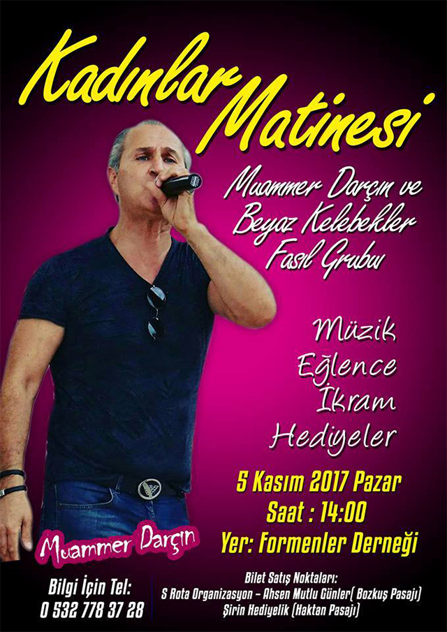 Batı Karadeniz Bölgesi’nin sevilen sanatçısı Muammer Darçın ile unutulmaz bir eğlenceye var mısınız? 5 Kasım pazar günü 14.00 – 17.00 saatleri arasında Ereğli’li kadınlar “Kadınlar Matinesi” özel programda Formenler Derneği’nde bir araya geliyor. Ereğli’li bayanlar, Muammer Darçın ile Kadınlar Matinesinde buluşuyor.