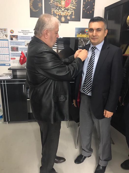 Ziyarette Başkan İsmail Yazıoğlu, Emniyet Müdürü Erkan Tektaş'a Türk Hava Kurumu rozeti taktı..