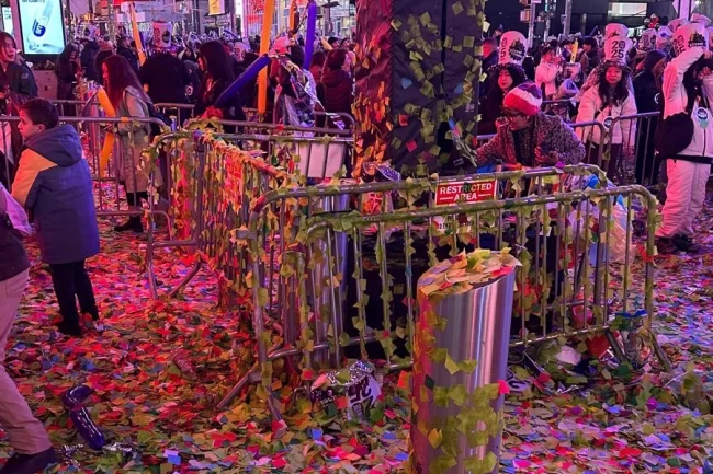 Times Meydanı'nda yeni yılın coşkusu bir yanda devam ederken, temizlenmesi gereken büyük bir atık yığını geride kaldı.