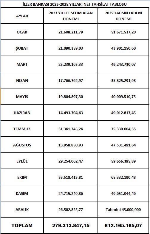 Aşağıdaki tabloda görüleceği üzere, önceki dönem belediyeye aktarılan gelirler ile 2025 yılında Sayın Tahsin Erdem dönemine aktarılan gelirler karşılaştırıldığında;