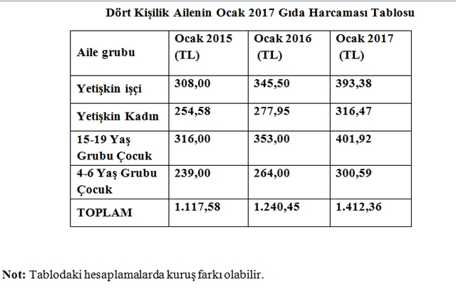 Ocak 2017-Haziran 2017 dönemini kapsayan ve 1.404,06 TL’ye çıkarılan asgari ücret 4 kişilik ailenin sadece mutfak giderini bile karşılayamaz durumda.