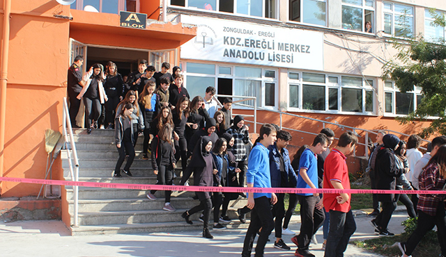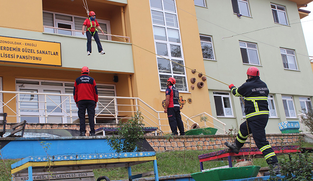 Kdz. Ereğli Belediyesi İtfaiye Müdürlüğü, ilçedeki 4 okulda toplam 2 bin 406 öğrenciye yönelik afet tatbikatı yaptı. Çalışma, diğer okullarda devam edecek.