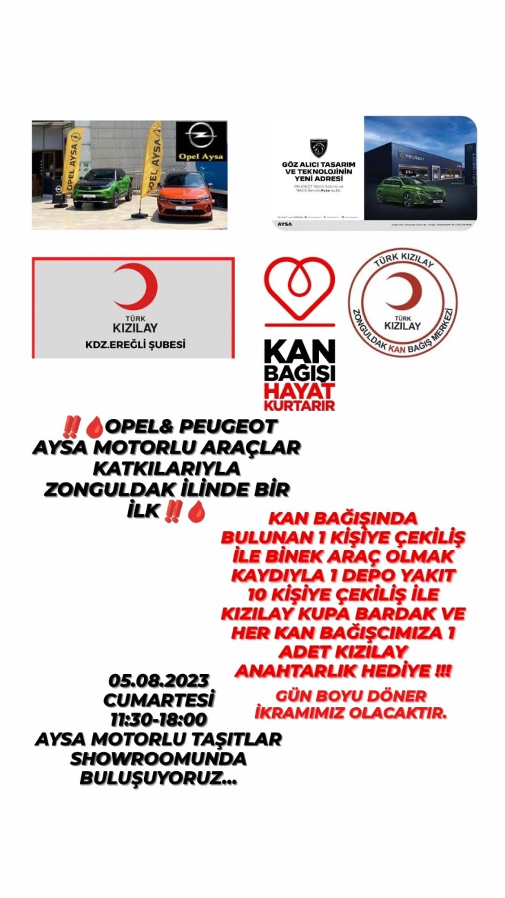Türk Kızılayı Kdz. Ereğli Şubesi Opel ve Peugeot Aysa Otomotiv ile kan bağışı kampanyası düzenledi. Kdz. Ereğli’de uzun yıllardır sosyal sorumluluk projelerine verdiği desteklerle her kesimin takdirini kazanan Opel ve Peugeot Aysa Otomotiv Sahibi Muhammet Aydın, düzenlenecek kampanyada kan bağışında bulunan bir kişiye çekilişle bir depo akaryakıt hediye edip, gün boyu döner ikramı yapacak.