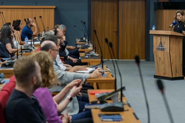 İzmir Büyükşehir Belediyesi'nin ev sahipliğinde ilçe belediyelerinin afet işleri sorumluları, İzmir'deki orman yangınları için buluştu.