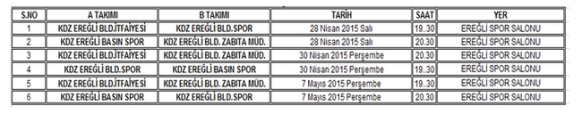 28 Nisan 2015 Salı günü İlçe Gençlik Spor salonunda saat 19.30da oynanacak İtfaiye-Kdz. Ereğli Belediyespor maçı ile başlayacak turnuvada aynı gün, Basın-Zabıta maçı da 20.30da başlayacak.