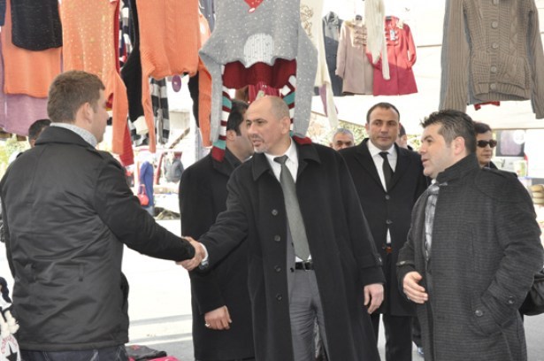 Özdemir, Cumartesi pazarında tezgah açan simitçisinden iç çamaşırı satan pazarcısına kadar herkesin tek tek elini sıkarak hal hatırını sordu, sorunlarını dinledi.