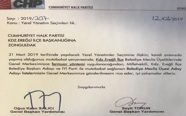 Edinilen bilgilere göre,CHP genel merkezi,Ereğli ilçe başkanlığına bir yazı göndererek,meclis üyeliği aday dayı listelerinin,İyi Parti ile mutabakat kurularak tespit edilmesini istedi.CHP genel merkezi,aday belirleme yönteminin de fermuar yöntemi olacağını belirtti.