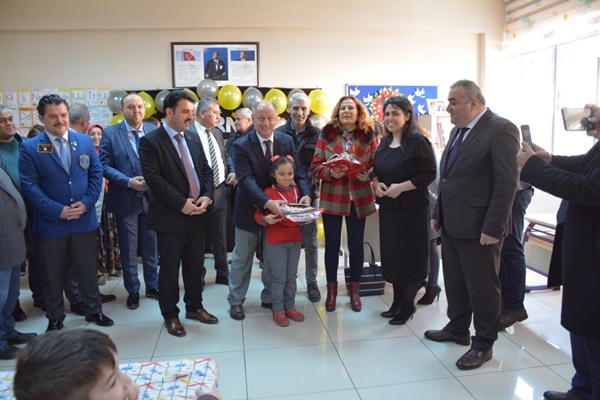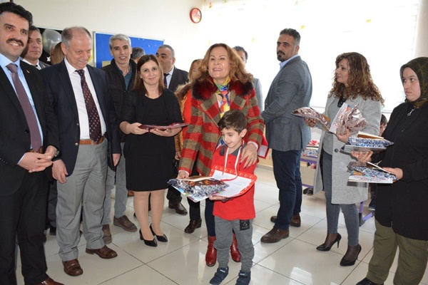 Köyü'nde karne dağıtım törenine katıldı.