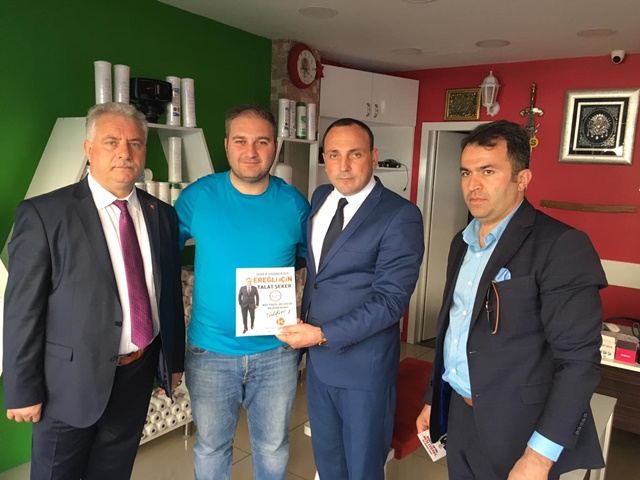 Milliyetçi Hareket Partisi İlçe Başkanı Rahman Demirtürk, Belediye başkan adayı Talat Şeker ile birlikte seçim çalışmaları kapsamında kapı kapı dolaşarak Milliyetçi Hareket Partisi Belediye Başkan adayı Talat Şeker için oy istiyor. Milliyetçi Hareket Partisi İlçe Başkanı Rahman Demirtürk, Erdemir ve uğur mumcu caddelerinde esnaf gezileri yaptı. Demirtürk ziyaretlerle ilgili açıklamasında “ Esnafın tepkisi olumlu. İkisini de denedik artık size oy vereceğiz diyorlar. Milliyetçi Hareket Partisi Ereğli’ de ivme kazandı diyorlar. Bu da bizim için gurur verici gelişme. Yerel seçimlerde zafer Milliyetçi Hareket Partisi’nin olacak” dedi.