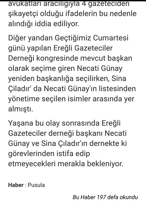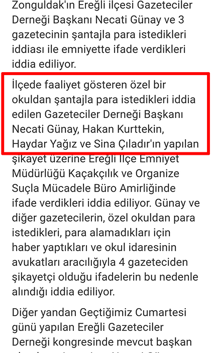 Pusula Gazetesi ve Elmas67 tarafından yapılan haber tarihinde Kdz.Ereğli Gazeteciler Derneği Başkanı ve Damar Gazetesi Sahibi Necati Günay ve Yeni Ufuk Gazetesi Genel Yayın Yönetmeni ve aynı zamanda Kdz.Ereğli Gazeteciler Derneği Başkan Yardımcısı Sina Çıladır, yalan haberde belirtildiği gibi ‘Şantaj’ iddiasıyla değil, ‘hakaret’ iddiasıyla KOM’da ifade vermişti.