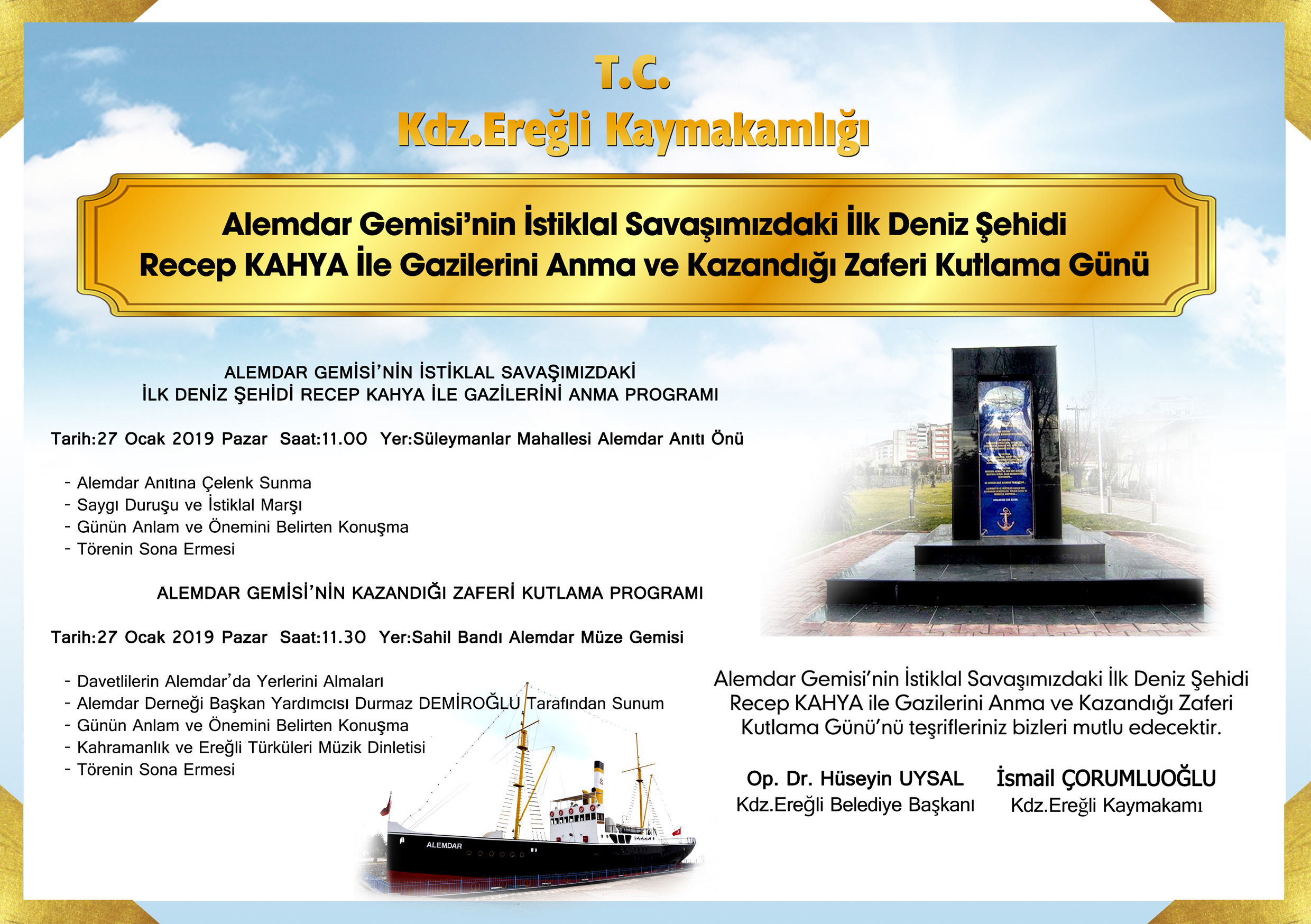 Kdz.Ereğli Kaymakamlı ve Kdz.Ereğli Belediyesi tarafından İstiklal Savaşı’nın ilk deniz şehidi Recep Kahya için anma töreni düzenlenecek.