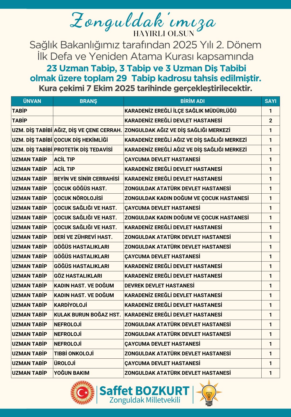 Milletvekili Bozkurt, yaptığı açıklamada: “Sağlık Bakanlığımız tarafından 2025 Yılı 2. Dönem İlk Defa ve Yeniden Atama Kurası kapsamında Zonguldak’ımıza 23 Uzman Tabip, 3 Tabip ve 3 Uzman Diş Tabibi olmak üzere toplam 29 Tabip kadrosu tahsis edilmiştir. Kura çekimi 7 Ekim 2025 tarihinde gerçekleştirilecektir.” dedi.