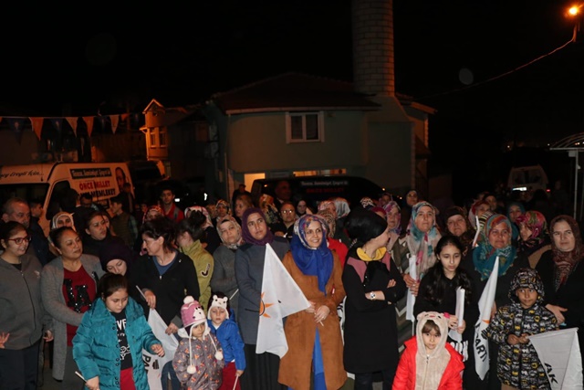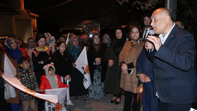 Günüz saatlerinde kapı kapı gezerek mahalle halkına projelerinin görsellerinin yer aldığı kitapçıkları dağıtan Şahin ve belediye meclis üyesi adayları akşam saat 20.00’de de mahallede miting gerçekleştirdi.