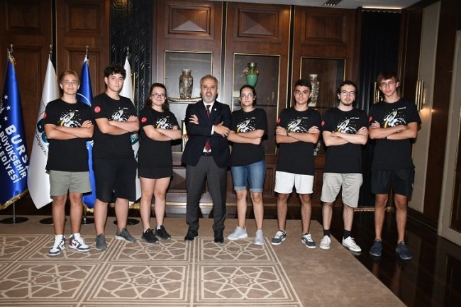 BURSA (İGFA) - Bursa'nın başarılı eğitim kurumlarından Özel Şahinkaya Koleji Academy ve Hexagon Kampüs öğrencilerinden oluşan Merküt Roket Takımı, 20 Ağustos Pazar günü Tuz Gölü'nde gerçekleşecek olan TEKNOFEST Teknoloji Yarışmaları finaline gitmeden önce Bursa Büyükşehir Belediye Başkanı Alinur Aktaş ile Sanayi ve Teknoloji Bursa İl Müdürü Latif Deniz'i makamında ziyaret ettiler.