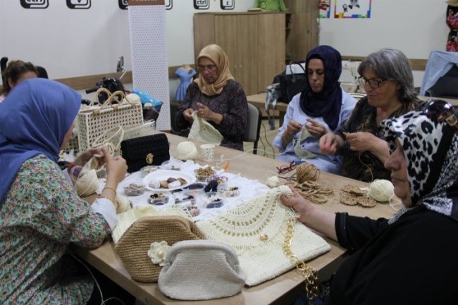 Dikiş sınıfındaki etkinlikte anneler kâğıt iplerden yaz sezonunda kullanabilmeleri için çanta hazırladı.