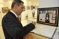 Sergilenen resimleri tek tek dikkatlice inceleyen Başkan Uysal, dernek üyelerine emeklerinden dolayı teşekkür ederek, Sanat Kurumu anı defterine görüş ve düşüncelerini yazdı.