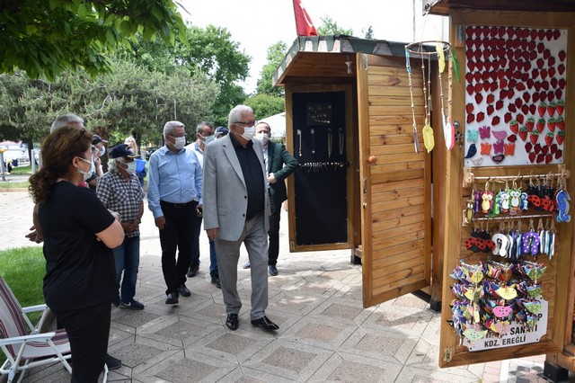 Başkan Halil Posbıyık, Ereğlili sanatçıların el işi ürünlerinin halkla buluştuğu stantların yer aldığı, ahşap ürünlerden, oyuncağa, naht sanatından, sedef kakma çalışmalarına, bastondan, el işlemelerine ve cam, seramik ile sepet ürünlerine kadar büyük bir çeşitliliğe sahip olan Sanat Sokağı’nda süren hazırlıkları yerinde inceledi.