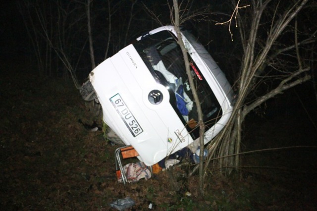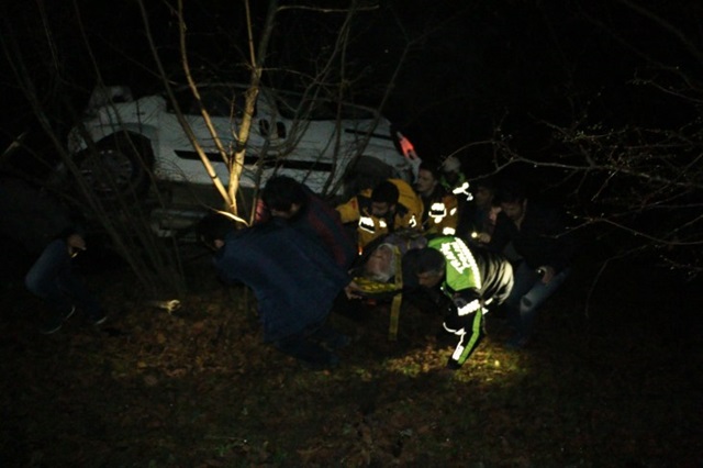 Kaza akşam 19.30 saatlerinde Zonguldak İstanbul Karayolu Elmacı köyü mevkiinde meydana geldi. Alınan bilgilere göre Ereğli’den Zonguldak istikametine giden 67 DU 526 plakalı hafif ticari kamyonet sürücüsü Mehmet Çelikel (65) Elmacı köyü mevkiinde aşırı sisten dolayı virajı alamayarak şarampole yuvarlandı. Yaklaşık 70 metre uça kamyonet ağaçları devirdikten sonra fındık ağaçlarına takılarak durabildi. Yoldan geçen ve kazayı gören köy minibüs sürücüsü sağlık, polis ve Zonguldak İl Afet ve Acil durum müdürlüğü ekiplerine haber verdi. Olay erine gelen ekipler araç sürücüsü Çelikel’e ulaşarak sedye ile patika yoldan yaralıyı ambulansa taşıdı. Ambulansta ilk müdahalesi yapılan Mehmet Çelikel daha sonra Zonguldak Bülent Ecevit Üniversitesi Eğitim ve Araştırma hastanesine kaldırıldı. Yaralı sürücü Mehmet Çelikel’in vücudunda ezikler olduğu ve müşahede altında tutulacağı öğrenildi.