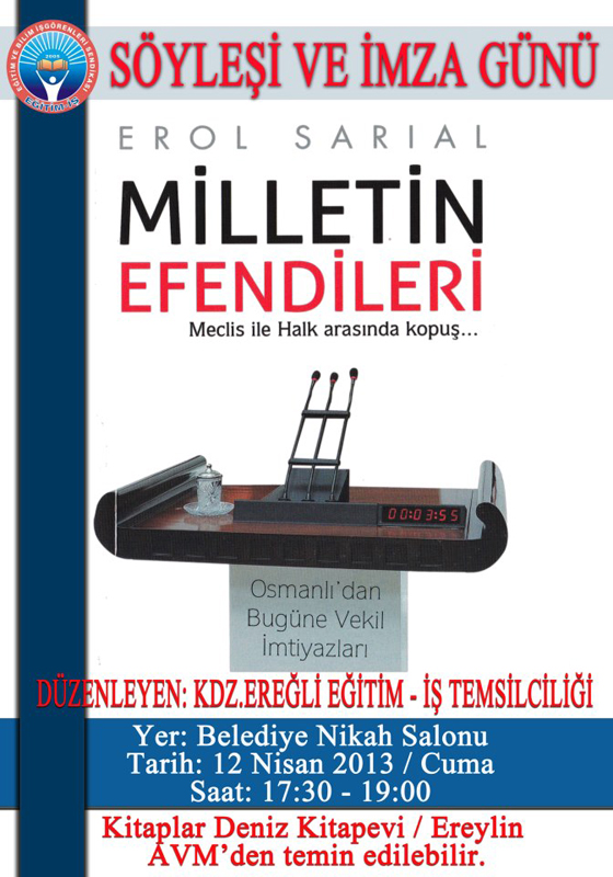 Kdz. Ereğli Eğitim-İş Temsilciliğinin düzenlediği Söyleşi ve İmza Gününde yazar Erol Sarıal, yeni kitabı Milletin Efendileri ile ilgili açıklamalarda bulunacak ve kitabını imzalayacak.