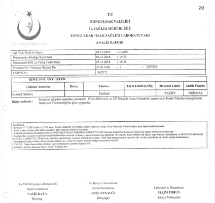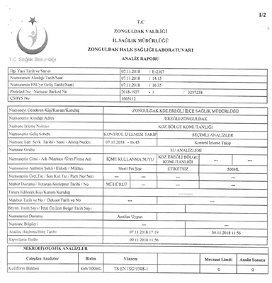 Kdz.Ereğli Kaymakamlığınca da onaylanarak Kdz.Ereğli Belediyesi’ne gönderilen analiz raporlarında, İl Halk Sağlığı Laboratuvarı’nca incelemesi yapılan Kdz.Ereğli Belediyesi şebeke suyunun, ’İnsani Tüketim Amaçlı Sular Hakkındaki Yönetmelik’ uyarınca uygun olduğu bildirildi.